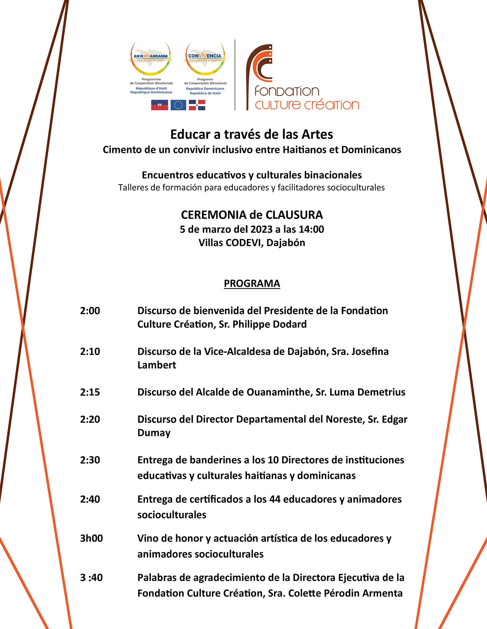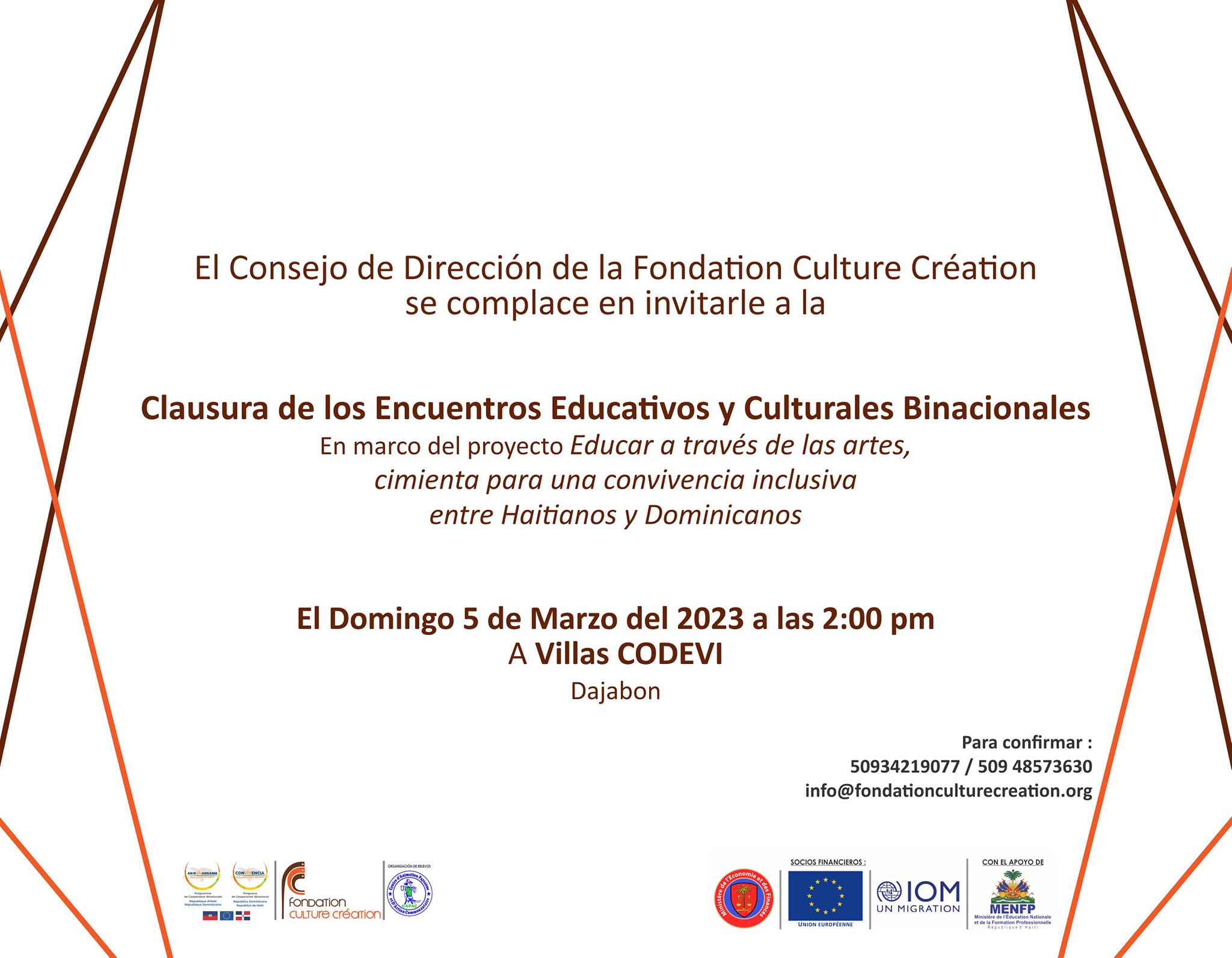 Share Facebook Twitter LinkedIn Pinterest Email INVITACION CEREMONIA de CLAUSURA 5 de marzo del 2023 a las 14:00 Villas CODEVI, Dajabon #annvivansanm #mefhaiti #IOMHaiti #MENFP Source