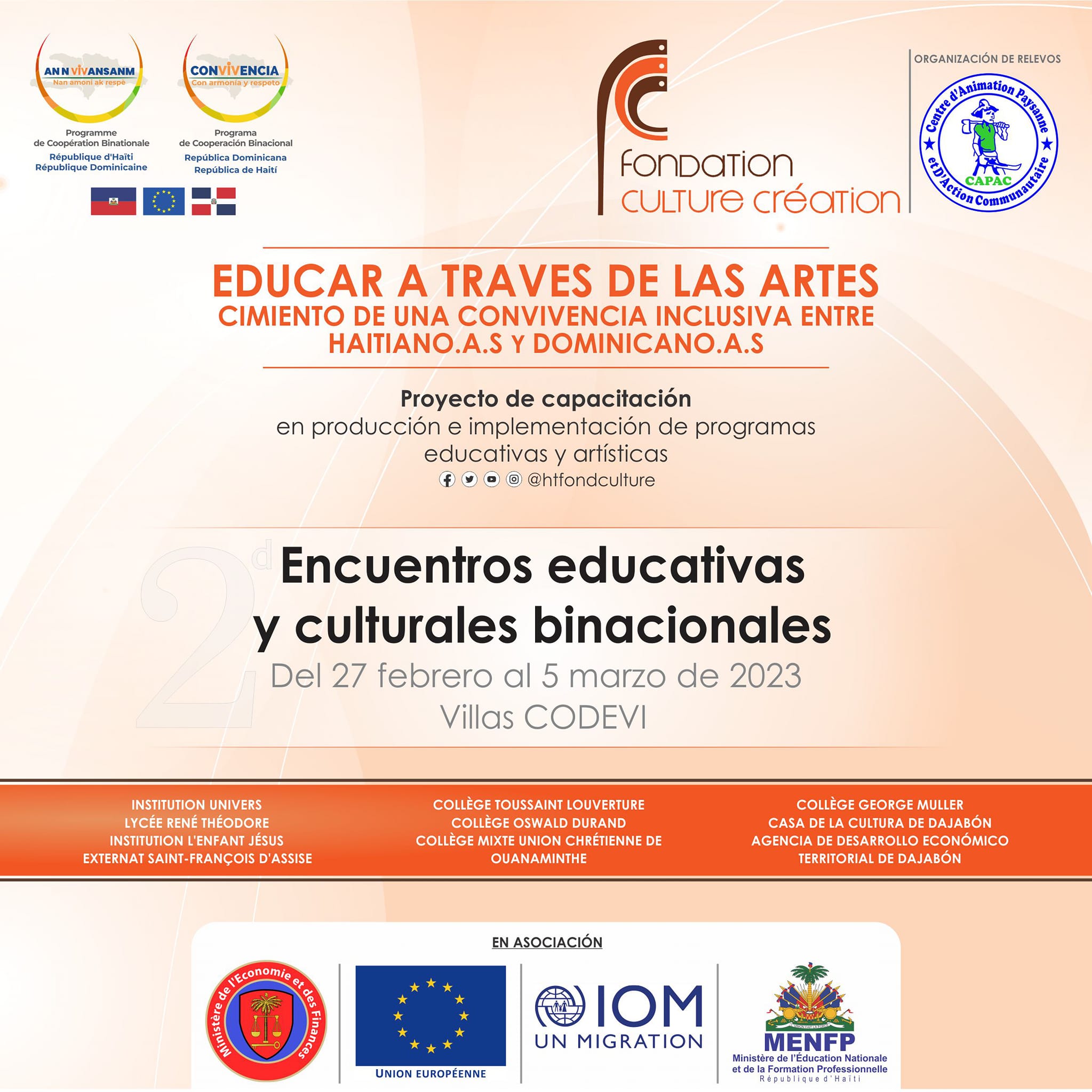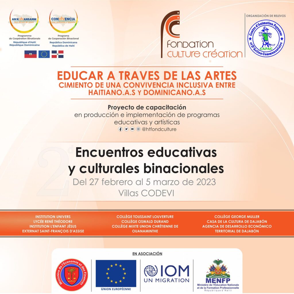 Share Facebook Twitter LinkedIn Pinterest Email La Fondation Culture Création poursuit ses activités de formation dans le cadre du projet Eduquer par les Arts, ciment d’un vivre-ensemble inclusif entre Haïtiens et Dominicains. #annvivansanm #https://web.facebook.com/mef.haiti #https://web.facebook.com/IOMHaiti #https://web.facebook.com/menfphaiti Source