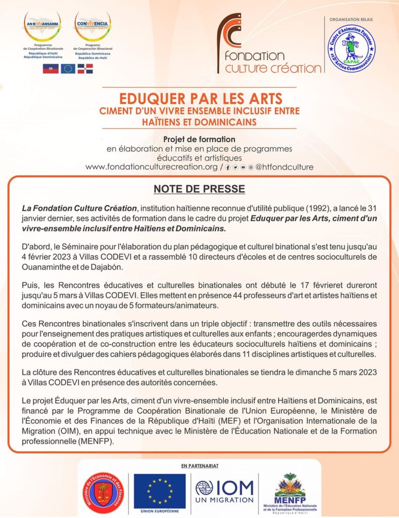 La Fondation Culture Création, institution haïtienne reconnue d’utilité publique (1992), a lancé le 31 janvier dernier, ses activités de formation dans le cadre du projet Eduquer par les Arts, ciment d’un vivre-ensemble inclusif entre Haïtiens et Dominicains.