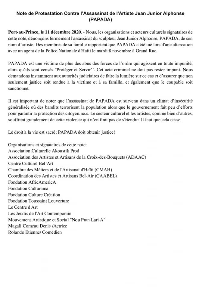 Port-au-Prince, le 11 décembre 2020. – Nous, les organisations et acteurs culturels signataires de cette note, dénonçons fermement l’assassinat du sculpteur Jean Junior Alphonse, PAPADA, de son nom d’artiste. Des membres de sa famille rapportent que PAPADA a été tué lors d’une altercation avec un agent de la Police Nationale d’Haïti le mardi 8 novembre à Grand Rue.