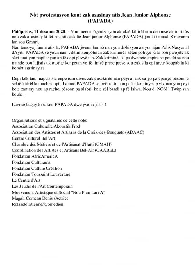 Pòtòprens, 11 desanm 2020. – Nou menm òganizasyon ak aktè kiltirèl nou denonse ak tout fòs nou zak asasinay ki fèt sou atis eskiltè Jean junior Alphonse (PAPADA) jou ki te madi 8 novanm lan sou Granri.