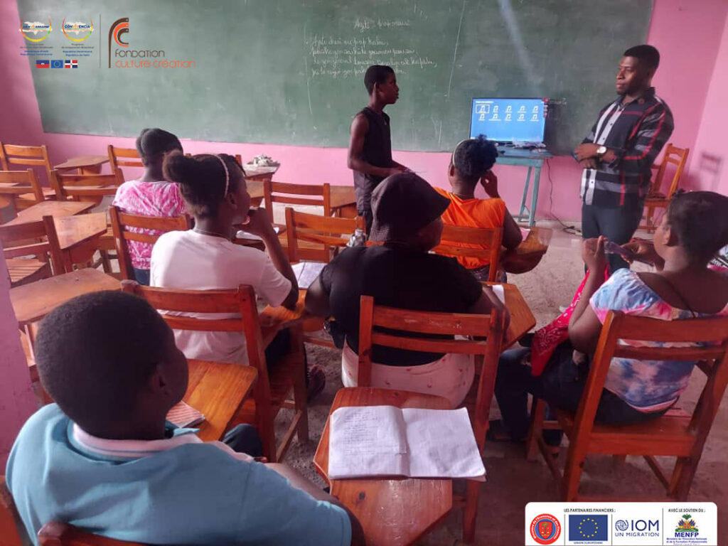 Share Facebook Twitter LinkedIn Pinterest Email PROJET ÉDUQUER PAR LES ARTS, CIMENT D’UN VIVRE-ENSEMBLE INCLUSIF ENTRE HAÏTIENS ET DOMINICAINS Jemael Saint-Firmin en classe de lettres et slam au collège Toussaint Louverture. #annvivansanm #mefhaiti #iomhaiti #uehaiti Source