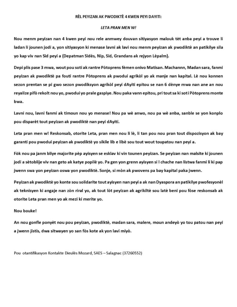 Nou menm peyizan nan 4 kwen peyi nou rele anmwey douvan sitiyasyon malouk tèt anba peyi a trouve li